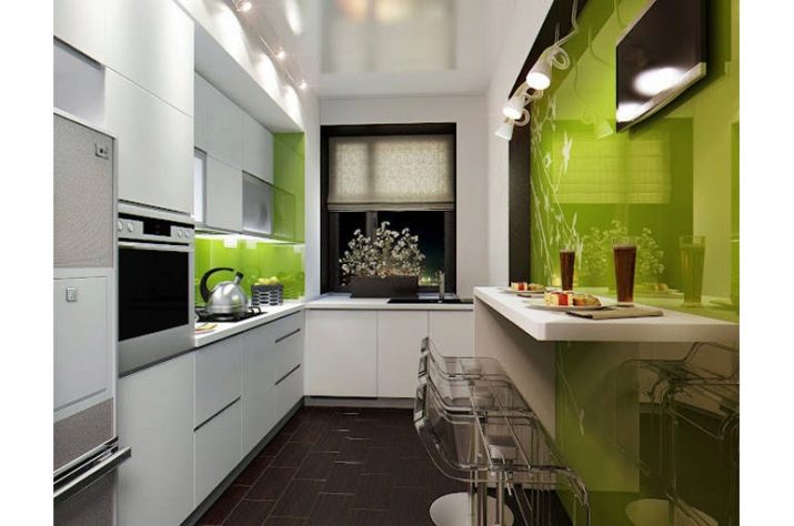 Що се отнася до мебелите, те също трябва да са в светли цветове. За тясна кухня мебелите с лъскави повърхности са чудесни. Те ще отразяват светлината и също така ще допринесат за визуално увеличаване на обема на пространството..