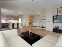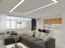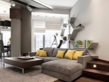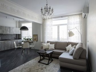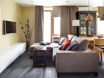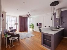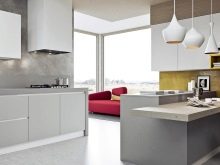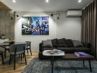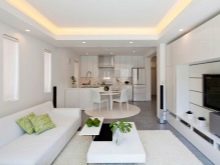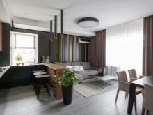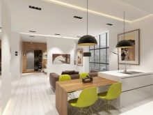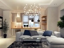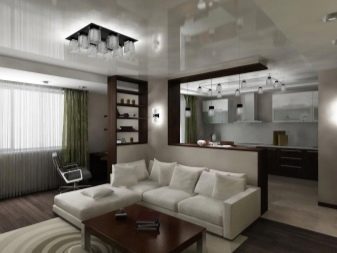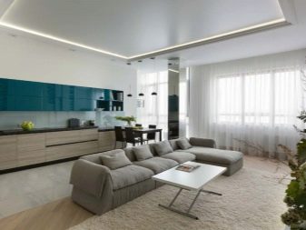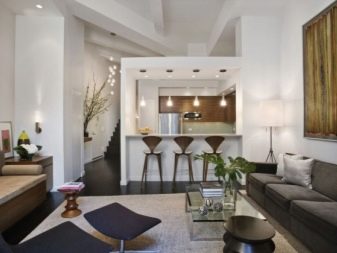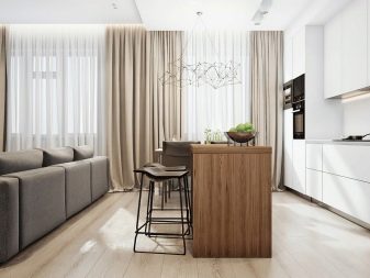 В малките апартаменти стените често се отстраняват, за да се създаде доста просторна кухня-хол. Неговият минималистичен интериор допълнително ще създаде визуално разширяване на пространството. За ефективно използване на такава зона тя трябва да бъде зонирана. Това може да стане по традиционния начин – с мебели. Мек ъгъл (дори и с лаконичен дизайн) ще се справи перфектно с тази задача, като ограничи работната зона и зоната за отдих.