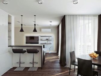 Ако стаята е малка, тогава е по -добре да инсталирате бар брояч. Столовете, разбира се, трябва да бъдат възможно най -прости. Поставяйки такава структура в центъра на пространството като остров, ще направите интересен акцент и в същото време ще получите няколко ясни зони: работна, трапезария и зона за отдих.