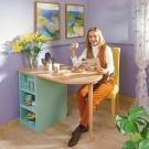 Друг удобен вариант, който винаги може лесно да се премества и няма да ви пречи под краката. Най -често дизайнът е следният: под плота е прикрепена специална релса, по която масата ще се движи хоризонтално. Обхватът на неговото движение зависи само от дължината на релсата, така че, ако желаете, можете да го направите така, че да се търкаля из цялата кухня.