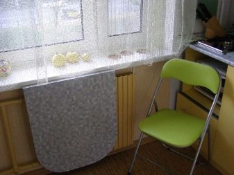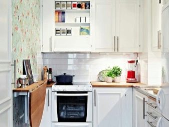 Много удобна, модерна идея за малка кухня. Същността на такава маса е, че е лесна за използване и наистина заема минимално място: тя е вградена в слушалките и, ако е необходимо, може да се извади оттам. Това е всичко, дори дете може да се справи. Най -добре е такава маса да е оборудвана с опорен крак, защото ако не е там, съществува риск да не се изчисли натоварването и да се счупи..