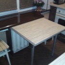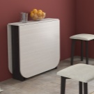 За да спестите повече място, можете да закупите квадратна сгъваема маса с размери 60×60 или дори по -тясна версия, широка 50 см. И само на пръв поглед тази конфигурация може да изглежда неудобна, всъщност тази опция ще осигури най -ергономичното използване на кухня, а при липса на място, може лесно да стане 2 пъти по -голяма. В допълнение, тази опция може да бъде оборудвана с допълнителни чекмеджета за съхранение на съдове, което ще я направи още по -удобна и функционална..