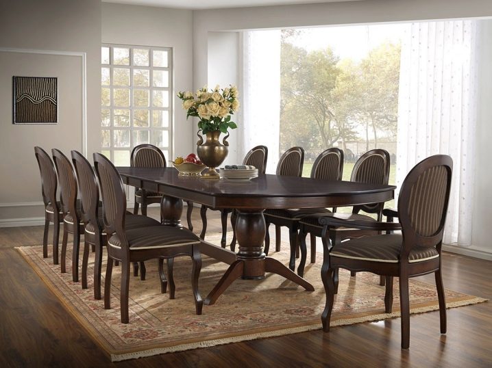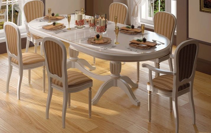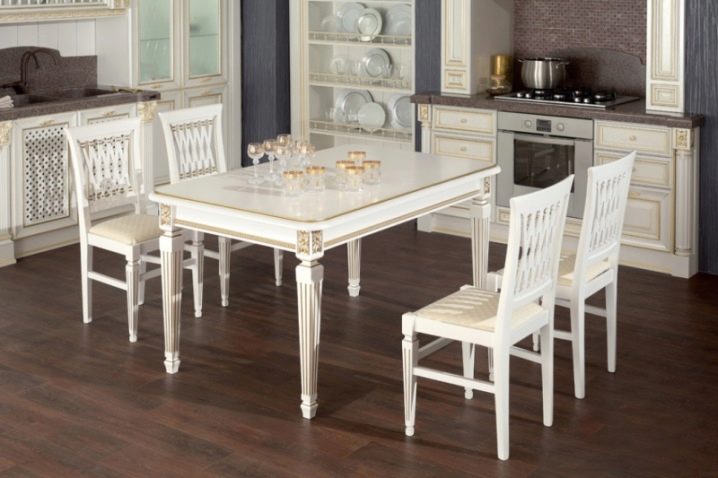 Приличната маса трябва да има придружители, които да съвпадат. Най -често те са включени в групата, но в отделни случаи се избират отделно. Разбира се, те трябва да са в хармония със стила на масата и да са леки. Ако кухненската площ е малка или средна, тогава е по -добре да изберете табуретки. Когато размерът позволява, тогава елегантните столове ще бъдат стилно решение, което от своя страна може да бъде декорирано или използвано самостоятелно. Столовете могат да имат меки, полумеки и твърди седалки. Зависи от стила и личните предпочитания..