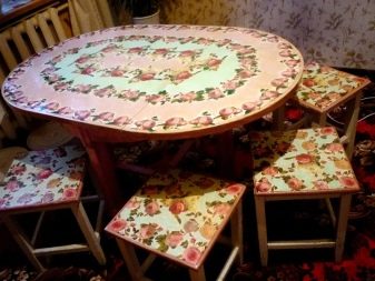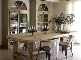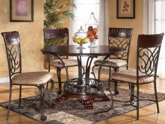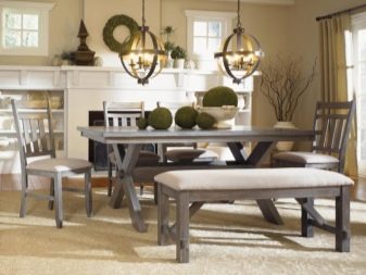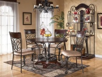 Обедна група в модерен стил придава своето специално настроение на стаята и трябва да съответства на вкуса на собствениците на тези слушалки. Художествените натури ще отговарят на класиката на Прованс с изкуствено състарени повърхности и мебели, боядисани с варосани цветове. Можете да се спрете на аристократичните мебели в стил Арт Нуво с елементи от ковано желязо на крака за маса и стол, стъклени плотове, причудливи форми.