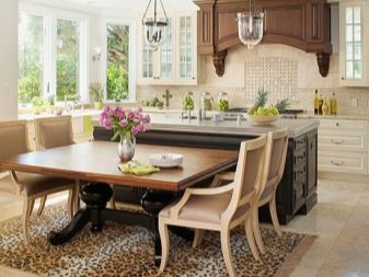 В просторна кухня, маса и столове с подходящ размер са поставени в центъра. Такова централно разположение може да бъде допълнено с ъглов диван, който ще замени някои от столовете, това е удобно за големи семейства с деца и когато много време се прекарва в кухнята..