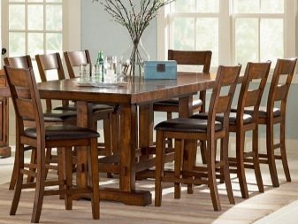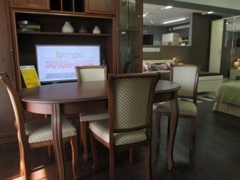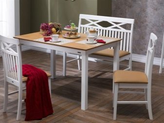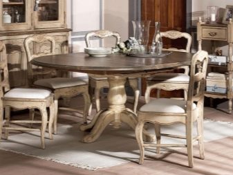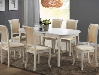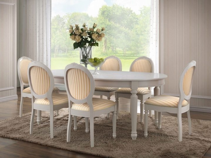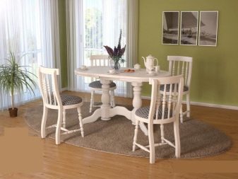 Класическият стил на мебелната група е съчетан с комплект от масивно дърво в естествен цвят и лека тапицерия на столовете. Такъв ансамбъл демонстрира добър вкус, изглежда солиден и елегантен.