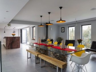 Групата за хранене ще добави динамика към интериора. хай-тек. Тук основното внимание се привлича към конструктивните елементи, наличието на метални компоненти. Такива ансамбли трябва да съответстват на целия стил на интериора, за да се създаде единна високотехнологична среда..