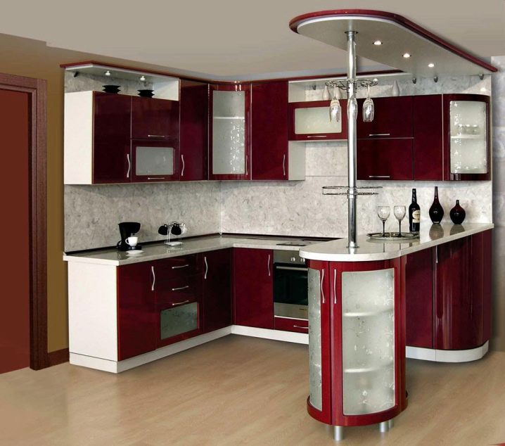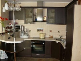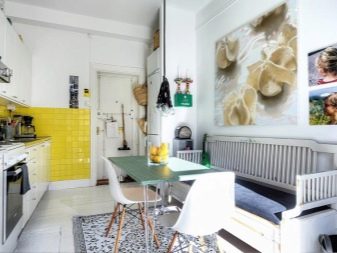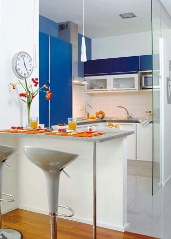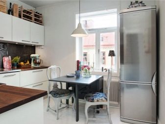В тясна кухня е по -добре да поставите масата с края й до стената, а столовете или табуретките около останалите страни, често отстрани един срещу друг. Масата може да бъде преместена в ъгъла, украсена с цветя, след което получавате уютна обстановка за вечери за двама. За по-младите собственици, които предпочитат да вечерят навън, традиционната маса може да бъде заменена с бар плот с високи табуретки, които се поставят в кухненското пространство или в центъра по протежение на слушалките с вградени уреди, заменяйки кухненския остров.