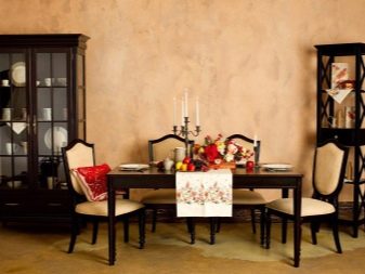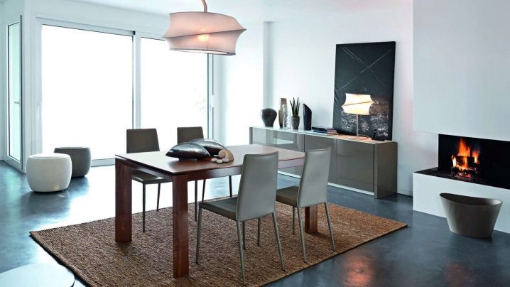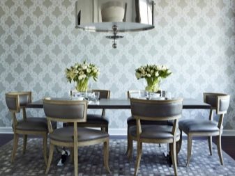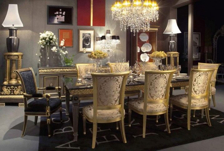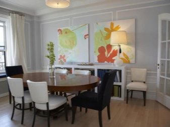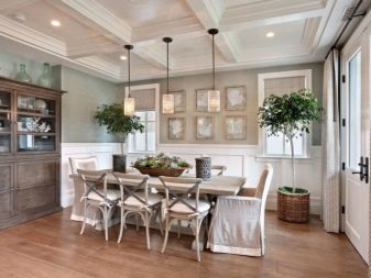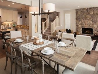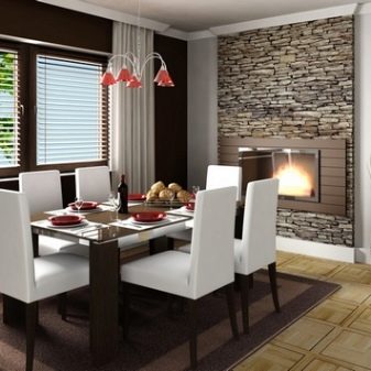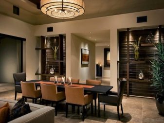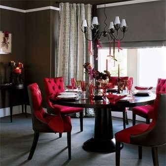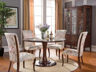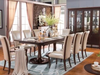 Завеси с ламбрекени, тапицерия, съчетана с тона на мебелите, добавя тържественост към интериора. Когато поставяте ансамбъл за хранене, трябва да следвате, така че изходът от помещенията да не бъде възпрепятстван и красиви и важни декоративни елементи като камина или скулптури.