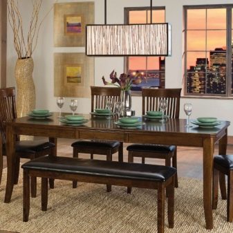 В ансамбли от мебели, изработени в етнически стил, са подходящи маси с пейка от естествено дърво вместо столове или табуретки.