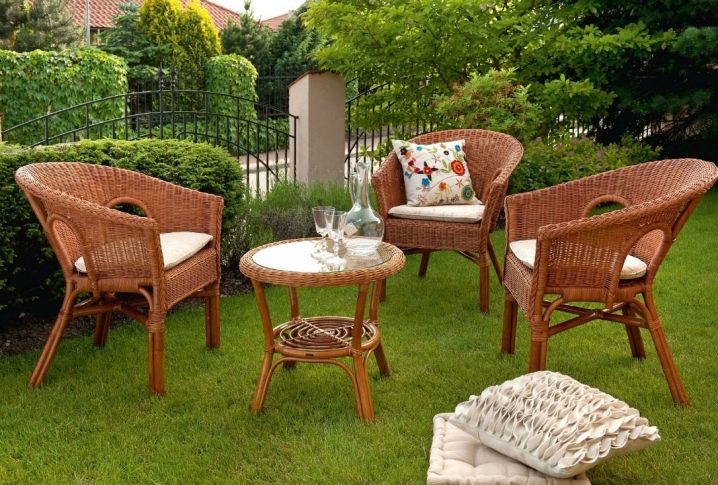 Плетените мебели са популярни в региони с топъл климат. естествен ратан. Тъкането добавя деликатност на мебелите. Комбинацията от плетени столове и дивани със стъклена маса изглежда добре. Тези групи за хранене са разположени на тераси или вътрешни дворове. Естественият ратан ще изисква известни грижи, за да го предпази от атмосферната влага, така че е по -практично да го замените с изкуствен..