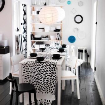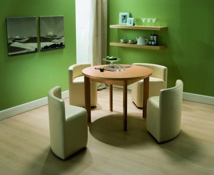 Компактна група за хранене може дори да бъде проектирана за един човек и да се състои от сгъваема маса и един, но много естетичен стол. Ако добавим тук малък диван, съответстващ на дизайна, тогава става възможно да се приемат гости.