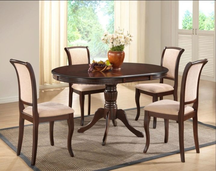 Ако е избрана овална или кръгла маса, тогава облегалките на столовете трябва да имат заоблени и гладки линии. Овална маса изглежда изгодно в центъра на просторна стая. Кръглата маса може да бъде поставена в центъра на стаята, до стената и в ъгъла. Повече хора седят на такава маса, удобно е да се доближите до нея, без да докосвате седналите до нея. Можете да добавите полукръгли или ъглови дивани към този ансамбъл. Редовните прави линии няма да се слеят с формата на кръга и ще дадат малко места.