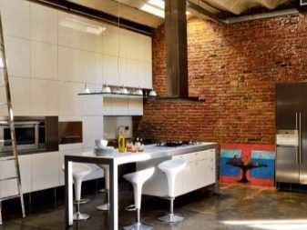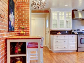 Нощни шкафчета и шкафове на кухненската работна повърхност с облицовъчни тухли също могат да бъдат успешно декорирани. Благодарение на зидарията можете да получите оригинално копие на истинска камина. Таванът може да бъде направен и с тухли, но такова смело решение в апартаментите няма да бъде подходящо, подходящо е само за селски къщи.