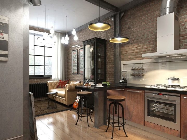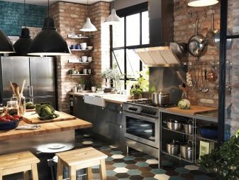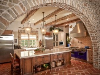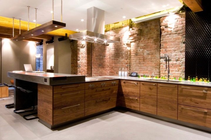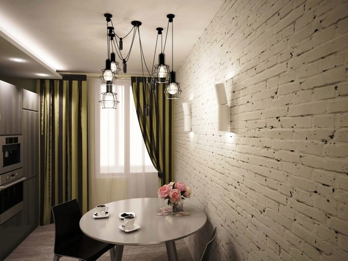 В кухня с такъв необичаен декор ще трябва да инсталирате допълнително осветление.. Естествената тухла абсорбира светлината, така че ако няма достатъчно, в стаята ще бъде доста тъмно.