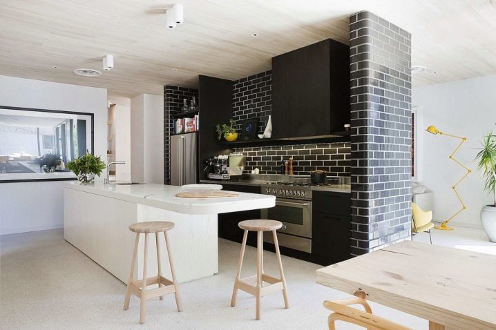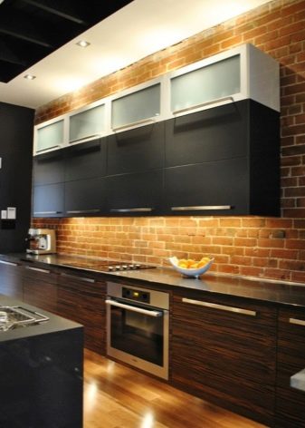 Тухла ще добави малко екстравагантност към стила на минимализма, но в този случай трябва да използвате този тип декор много внимателно. Експертите препоръчват боядисването на зидарията с подходящ цвят, например черен. Черната кухня ще отразява най -добре стила на минимализма..