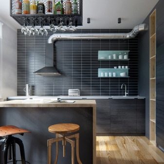 Строг готически стил, тухлена стена може елегантно да се разнообрази, но тук трябва ясно да разберете какъв цвят и метод на облицовка да изберете, така че кухнята да не се превърне навън в мазе.