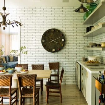 Най-често тухлена стена в кухнята се прави в домакинства в селски стил или таванско помещение. Разбира се, това е правилно, но модерната тухла под формата на довършителен материал е по -универсална, тя е перфектно комбинирана с други стилове..
