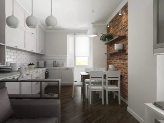 Благодарение на тухлената стена можете успешно да подчертаете функционалните зони на кухнята, например трапезарията. Основното е да се вземе предвид размерът на стаята и едва след това да се направи тухлена стена, която ще бъде в най -добра хармония с други довършителни материали..