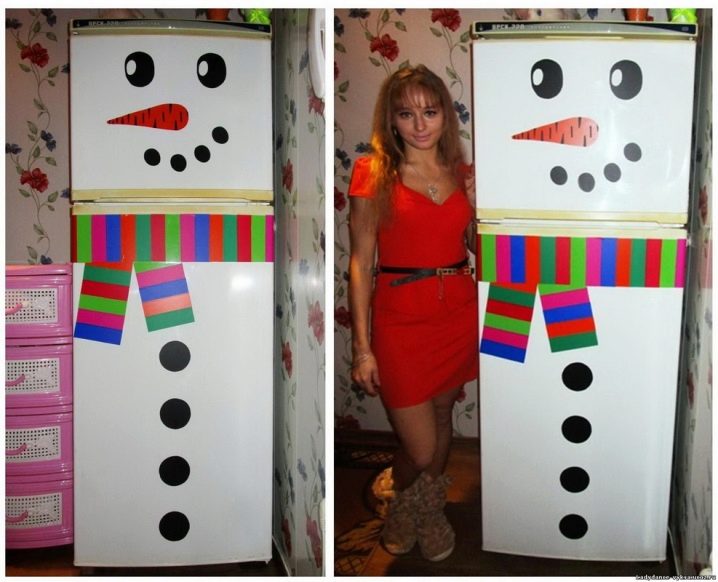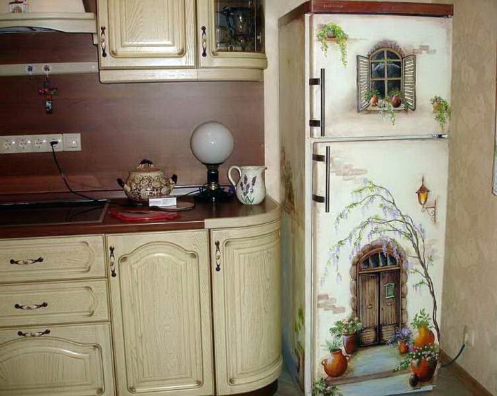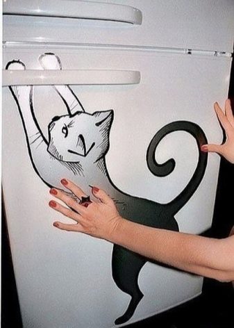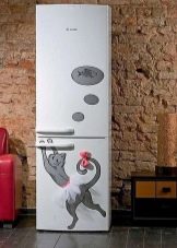 За тези, които обичат да мечтаят, е подходящо комбинираното поставяне на хладилника, при което цветовата схема е избрана в съответствие с преобладаващите нюанси на дизайна в кухнята. Ако например кухнята е декорирана в синьо, тогава хладилникът може да бъде залепен със синьо фолио. Декорирането на хладилника в червено и черно също изглежда красиво. Всичко зависи от вашите предпочитания и въображение. Във всеки случай обаче всичко трябва да се направи възможно най -внимателно – само така резултатът ще бъде перфектен..
