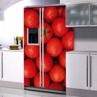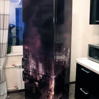 Качеството на печат върху филм също се счита за важен момент. Често, за хармонично съчетание на хладилника с общия интериор на кухнята, експертите препоръчват да изберете независимо изображение, което след това се дава на печатното студио и се прилага върху бял филм. В този случай можете да поръчате обичайния широкоформатен печат, но за дизайна на хладилника е по-добре да се даде предпочитание на специален вътрешен печат. Така че рисунката е много по -ясна, тя е близо до качеството на снимката..