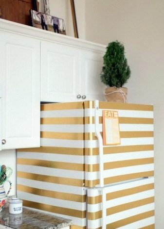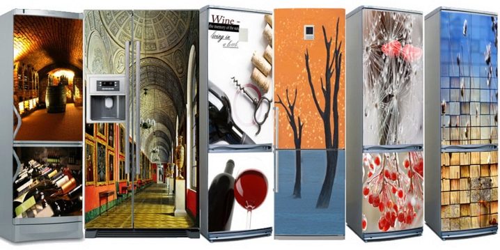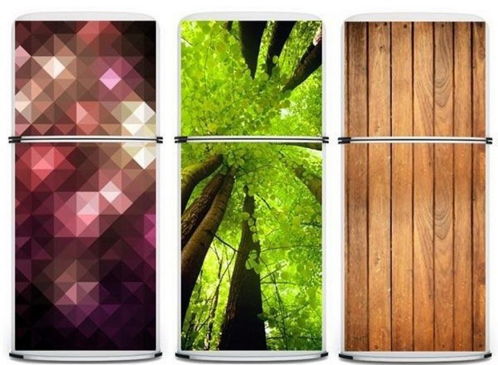 Напоследък самозалепващият се материал със снимки, етнически мотиви, флорални аранжировки и изображения на животни е в голямо търсене. Самозалепващи се могат да бъдат закупени както в монохроматичен дизайн, така и в различни цветове – всичко зависи от цялостния интериор на кухнята. За любителите на модерността правилното решение би било да украсите хладилника с филм с вълнообразна повърхност или с шарки под формата на квадратчета и диагонални ивици. Ако кухнята е декорирана в класически стил и е изпълнена с дървени мебели, чудесен вариант е да поставите хладилника под дърво.