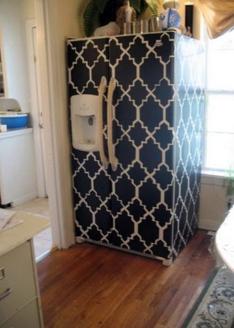 Правилното решение би било да украсите хладилника си с винилов филм. Днес има голям избор от самозалепващи материали. Той е представен в различни нюанси и текстури, както и с използването на печатни елементи. Основните предимства на винила са здравина, висока износоустойчивост, надеждна защита срещу влиянието на околната среда. Виниловото фолио е най -подходящият вариант за поставяне на хладилника. Той е лесен за използване и всеки може да работи с него. Благодарение на този вид декорация, старият хладилник бързо ще се превърне в шикозен „красавец“ с повърхност като кадифе, мрамор, дърво.