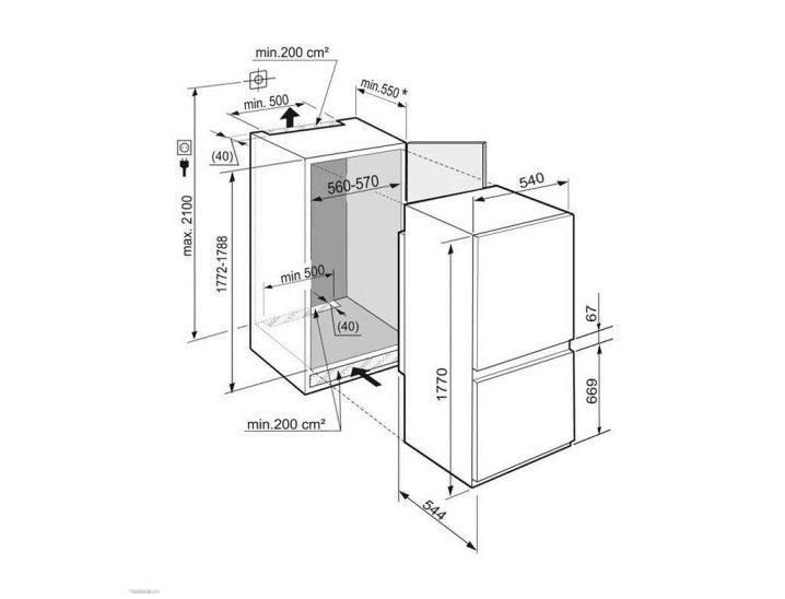 Размерът е един от най-важните показатели за всеки вграден хладилник.. Тук е необходимо да се вземат предвид не само личните предпочитания и техническите характеристики на устройството, но и възможностите на шкафа, в който ще бъдат вградени домакински уреди. Преди закупуване е задължително да се измери ниша или шкаф, така че инсталацията да се извърши без никакви проблеми.