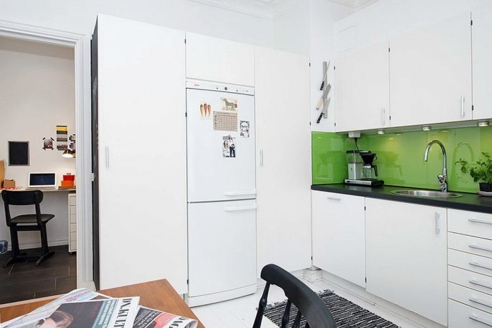 Най -често хладилникът в килера се поставя на ръба на слушалката – ъглов или прав. Това е най -високата точка в интериора, а останалата част от „рисунката“ отива на нивото на талията. Има обаче и други интересни опции за оформление..