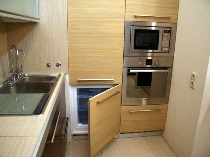 По -специално хладилникът може да бъде скрит в шкаф под работната повърхност. За тази цел обикновено се купуват две малки, високи до 80 см единици, които се поставят един до друг.. Можете да ги разделите тематично, например от дясната страна – месо и млечни продукти, от лявата – плодове и зеленчуци.. Изглежда оригинално, много необичайно и избягва разликите във височината в интериора. Разбира се, ще има малко място за съхранение на храна. Освен това, за да достигнете до нещо, всеки път трябва да се наведете или да клякате..