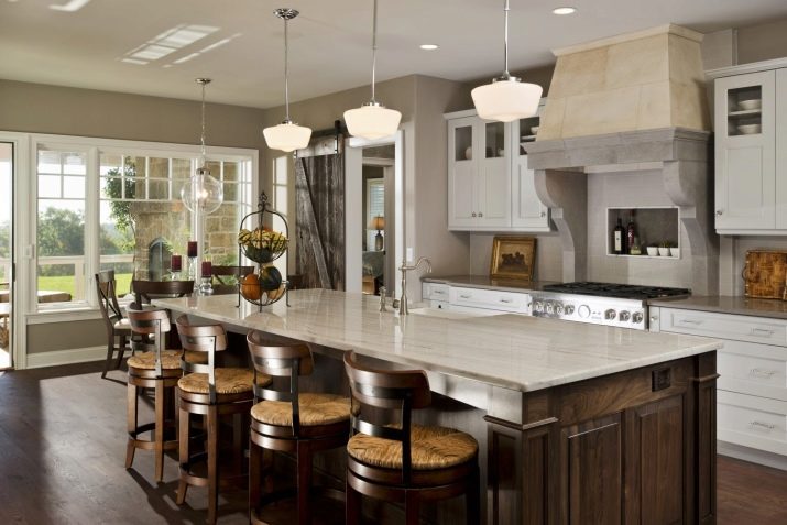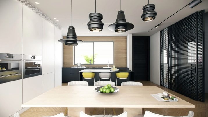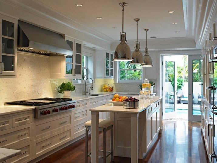 Създаването на подходящо осветление в една стая е важно и трябва да обърнете специално внимание на този процес. Използването на различни лампи, аплици и полилеи ви позволява да определите най -функционалните зони в кухнята.
