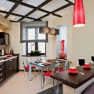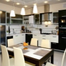 - Минималистичните кухни могат да бъдат декорирани с красиви плътни цветове. Висящите модели са най -добре разположени над масата.