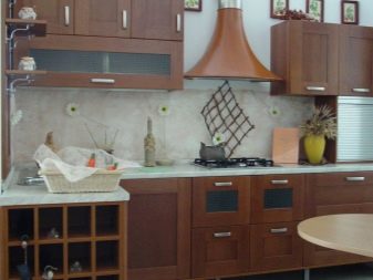 - ПДЧ се покрива под налягане с меламинов филм в цвят дърво. Филмът трябва да бъде измерен според размерите на плочата. Такова ламинирано покритие е евтино, но качеството на такива слушалки оставя много да се желае. Фолиото може лесно да се отлепи под въздействието на вода и пара, особено на места близо до фурната или до мивката. Такъв комплект изисква много бързо актуализиране на някои елементи или дори ще е необходимо да се заменят някои шкафчета или дори цялата кухня..