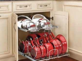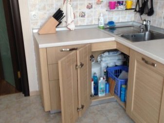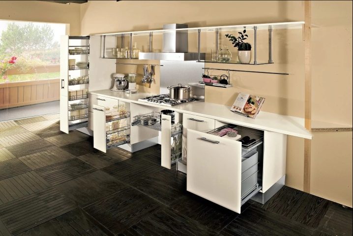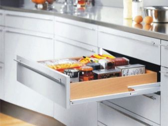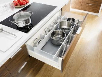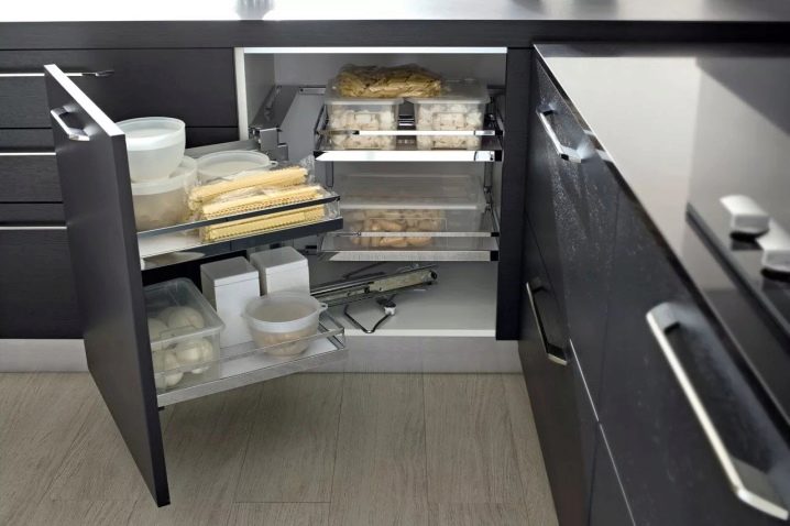 Ъгловите чекмеджета все повече печелят любовта на клиентите, особено за мебели за малки кухни. Когато чекмеджетата са подредени под ъгъл от 90 градуса, се спестява много място, а механизмът с пълно чекмедже ви позволява да скриете предмет в дълбините на такъв шкаф.