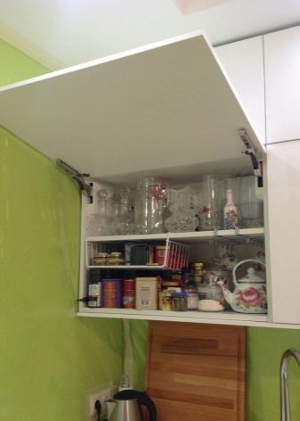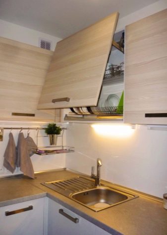 Плъзгащите се врати са много удобни при работа в кухнята, тъй като елиминират проблема с нараняване. Те са лесни за работа. Единственият недостатък на такива шкафове е честата им настройка и подравняване, освен това е по -добре да инсталирате ограничител за отваряне.