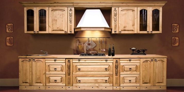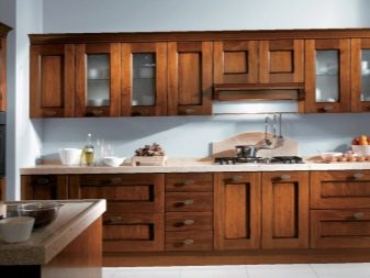Дървените врати от естествено масивно дърво изглеждат много красиви, освен това такива врати са издръжливи, екологични и надеждни. Вратите на шкафа, изработени от дърво, съответстващи на входните врати, се използват за създаване на безпроблемен дизайн в кухненския интериор. Единственото нещо е, че дървото, дори обработено със специално съединение и лакирано, е много податливо на деформация.. Парата и горещият въздух могат да го изсушат или, обратно, материалът да набъбне. Цената на кухня от масивно дърво е много висока, като се има предвид ниската устойчивост на износване, такива разходи не са напълно оправдани.
