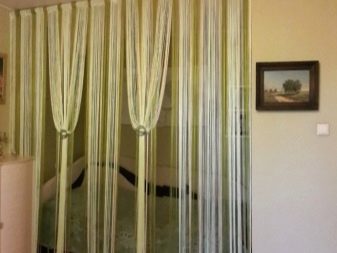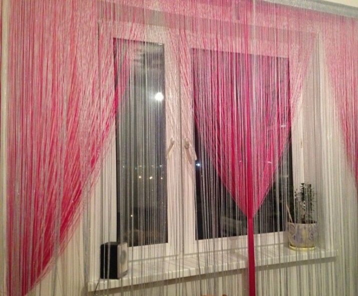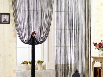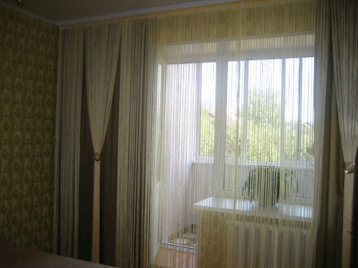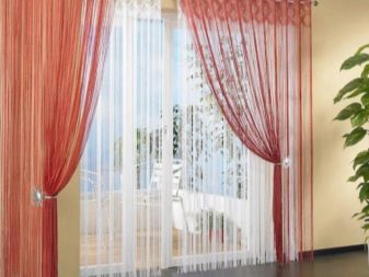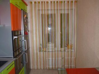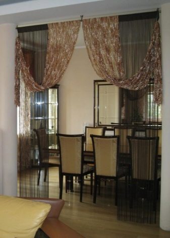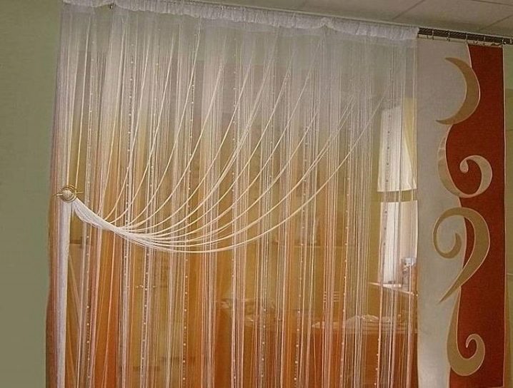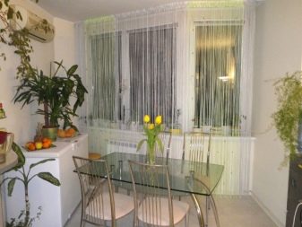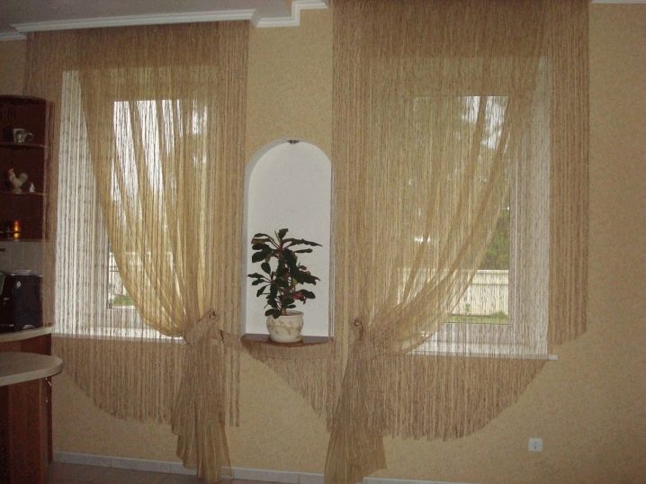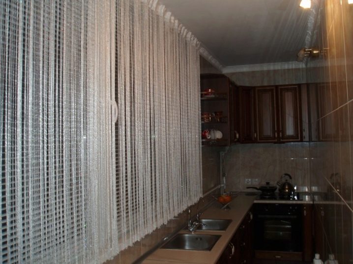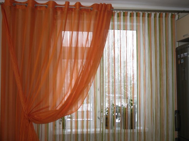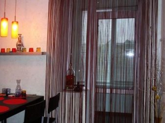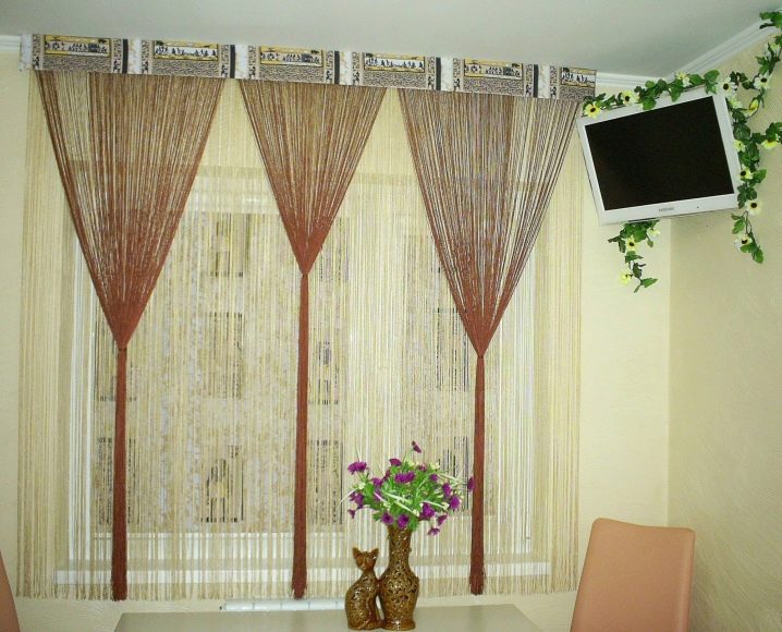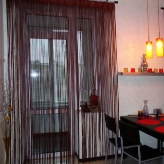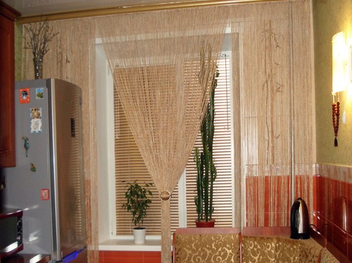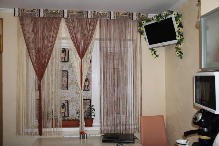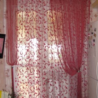 Често в кухненския дизайн завесите се комбинират с текстил. И така, широка лента от плат се прокарва през нишките или завесата е завързана с голям лък. Завеса, изработена от плътен плат, окачена близо до нишките, ще изглежда добре. В допълнение, интересен вариант би бил да украсите нишките с големи мъниста от различни материали. Разнообразни тънки нишки успешно украсяват ниши.