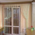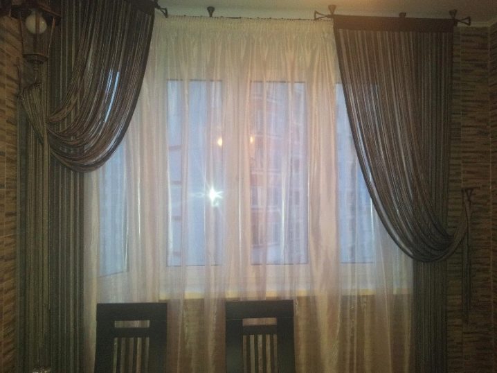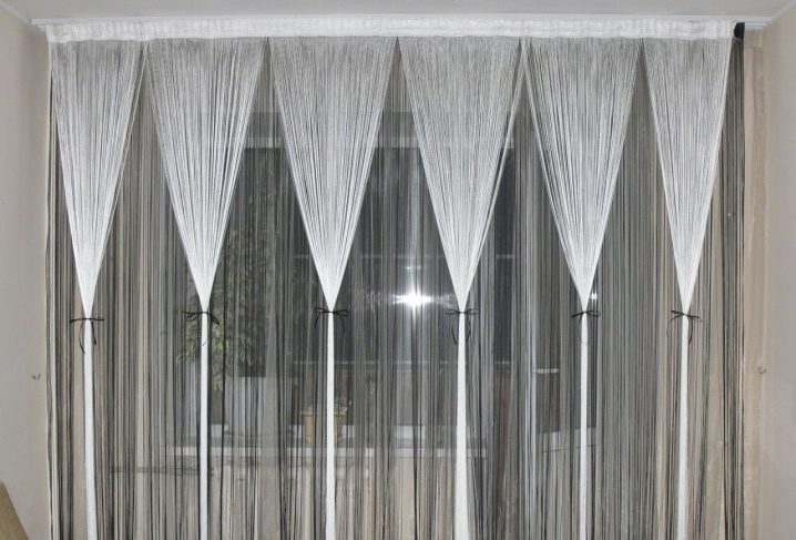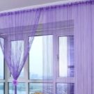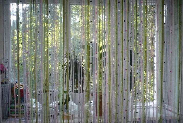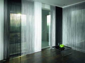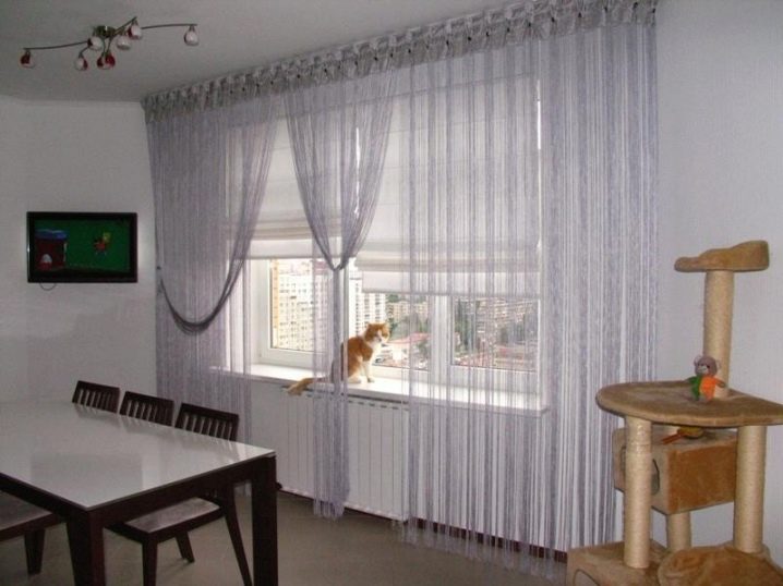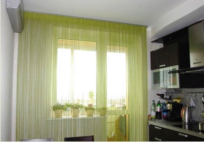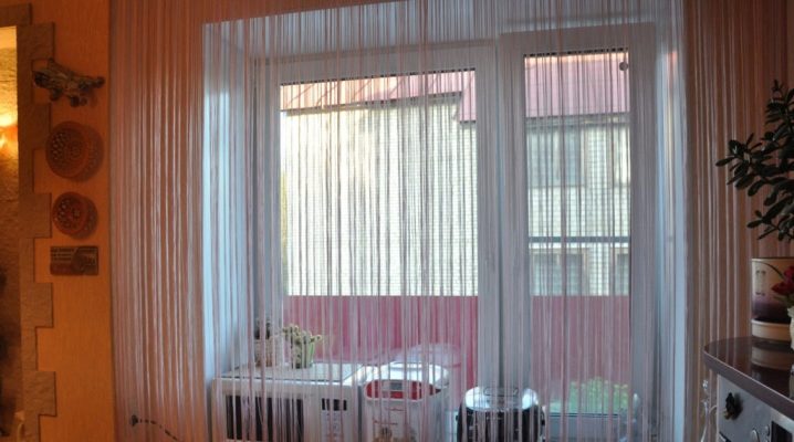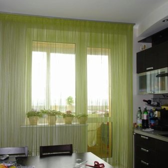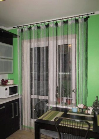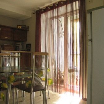Завесите са оригинални, които съдържат многоцветни нишки, които не са еднакви по размер. Благодарение на завесите с нажежаема жичка, можете да играете със светлина и сянка в трапезарията на кухнята. Също толкова изгодна е комбинацията от завеси от прежди с щори и естествени фрагменти, например дърво или бамбук..