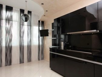 Ако в кухненския интериор има много хромирани и стъклени изделия, завесите с лурекс, сребърните нишки с метални мъниста изглеждат хармонично.
