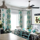 Имайки предвид обстановката на кухнята, си струва да обмислите орнаменти, шарки и апликации за вашите завеси. За едноцветен продукт можете да се ограничите до контрастни аксесоари, като цветни скоби, шарени ламбрекени. В провансалски, ботанически, бохо-шиков стил доста често се използва малък цветен модел, деликатна палитра от нюанси на сиво, бежово, праскова, кремаво, бледо розово, тюркоазено. За повече лукс можете да използвате тоналността на индиго, кралско синьо, ултрамарин. Успокоява и успокоява зеления цвят, смарагд, който перфектно облагородява еко стила.