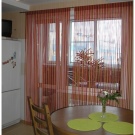 За цветна кухня е по -добре да използвате обикновен муселин, който също ще се вкорени в залата, хола. За стая, поддържана в един цвят, за стая в студио апартамент, можете да изберете дъгови завеси от стъклени мъниста. Често се наричат завеси-юфка, допълнени с лурекс, пера. За авангард, пин-ъп стил, шаби-шик-това е истинска находка.