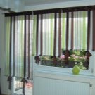 Завеса от муселин ще се впише органично в кухненското пространство. Първоначално тя украсява прозорец с балкон с помощта на жартиери, необичайно разделение на няколко реда с различни дължини и местоположения. Такъв модел, въпреки че не предпазва от пряка слънчева светлина, прави кухнята визуално по -широка и по -лека. Доста често те се комбинират с други опции за завеси..