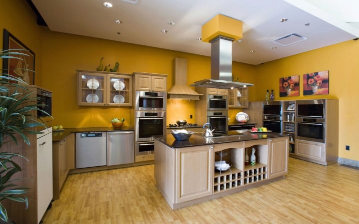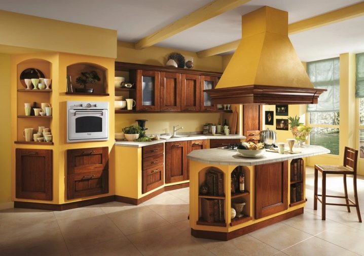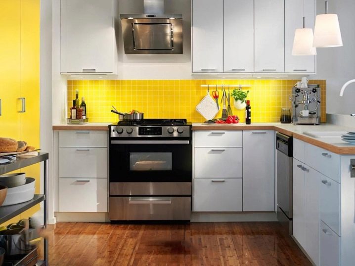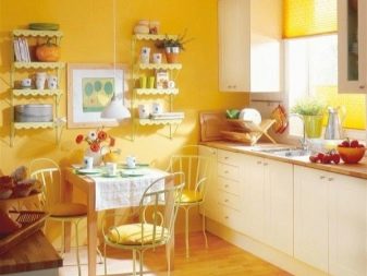 Жълтият цвят във всякакви нюанси винаги ще изглежда изгодно в интериора на кухнята. Яркото и богато жълто е подходящо за модерни интериорни стилове. Тъмните нюанси на жълто, например със средни цветя и шарки, са идеални за класически интериор или кънтри и Прованс.