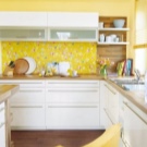 Комбинацията от бял или сив кухненски комплект с жълти мебели ще бъде много полезна, ако имате само една жълта стена или жълта кухненска престилка.