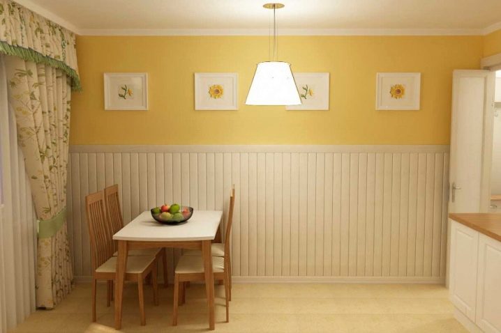 Комбинираните решения също са много интересни, когато зоната за готвене е оформена с плочки, а трапезарията е залепена с тапет. Отлично решение би било да изберете жълти или лимонови плочки, а зоната за хранене може да бъде залепена с тапети от всякакви светли нюанси..