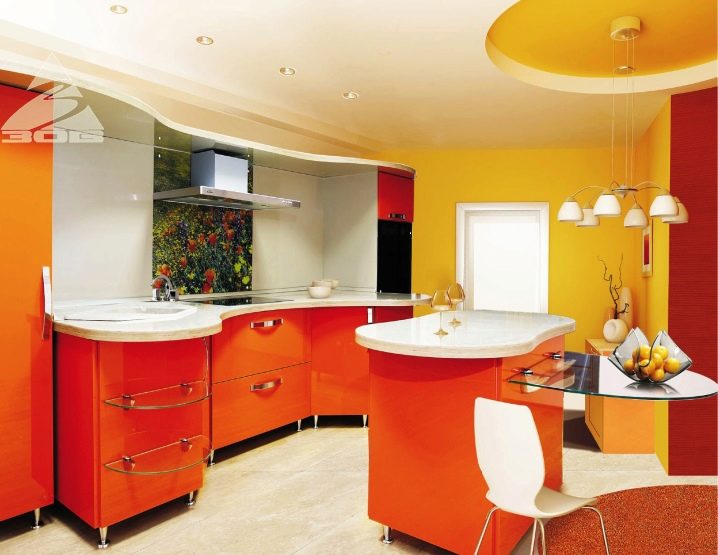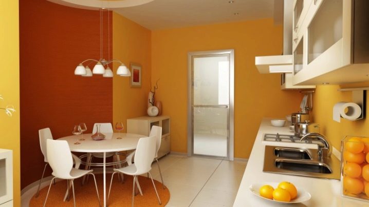 Жълто – оранжевият дизайн на кухнята ще бъде много полезен за много ярки личности. Стените могат да бъдат боядисани в жълто и допълнени с оранжево или прасковено обзавеждане, бяла маса и столове и сребърни уреди могат да се използват за създаване на акценти. Основното нещо е да не прекалявате с тези топли цветове, те трябва да се разреждат с други, светли нюанси..
