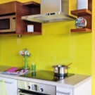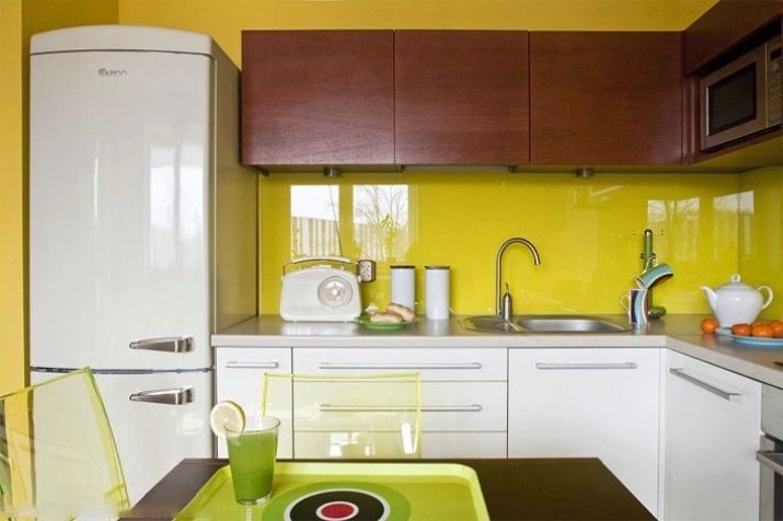 Комбинация от жълти и зелени цветове ще изглежда необичайно и интересно. С тяхна помощ можете да комбинирате стени и да ги разнообразите с мебели от ярки цветове. Използването на тези цветове ще направи кухнята по -удобна и оживена..