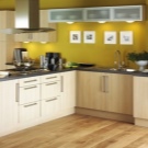 Ако искате селска, прованска или кухня в стил хижа, тогава различни дървени кухненски комплекти ще изглеждат добре с жълти тапети. В допълнение, жълтите плочки ще се впишат добре в интериор с дървена кухня, вероятно с различни абстрактни форми..