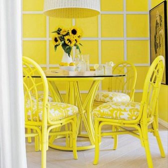 Избирайки жълто като основен цвят, дайте предпочитание да го комбинирате с други нюанси или изберете по -спокоен светложълт цвят. Киселите, ярки, лимонови цветове и нюанси са по -подходящи за детайли, а не за цялостна декорация на стени. Въпреки че, ако използвате тапет с различни ярко жълти детайли, за да украсите една стена, тогава защо не.