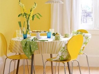 В допълнение към жълтите тапети или панели с жълти тапети, можете да използвате жълти мебели, като столове, за да запълните кухнята си с разнообразие от ярки акценти. Жълтата техника също ще изглежда необичайна и ярка. Или можете да добавите топло докосване с жълти часовници, съдове или различни декоративни елементи, като вази с цветя и текстил..